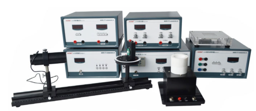 由温度控制器、光强分布测试架、测试电源、混色实验系统以及点阵显示实验系统构成,主要用于完成:(1)LED的伏安特性实验;(2)LED的电光转换曲线测试实验;(3)LED的光强空间分布实验;(4)LED混色实验;(5)LED的温度特性实验;(6)LED矩阵显示实验;